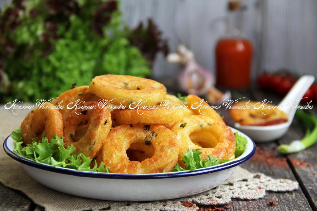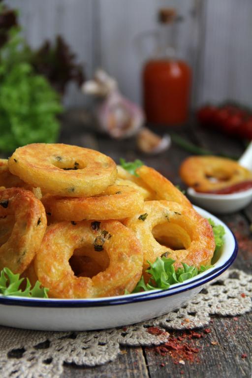Нежные, вкусные, аппетитные картофельные кольца подать к столу.