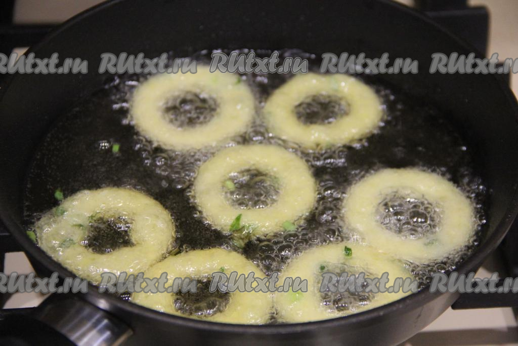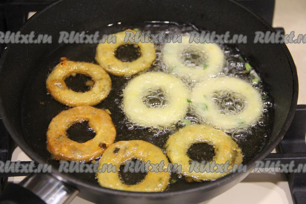 На сковороде (или в кастрюле с толстым дном) разогреть растительное масло. Аккуратно выложить картофельные кольца в масло (масла должно быть достаточно много, чтобы оно практически полностью покрывало кольца).