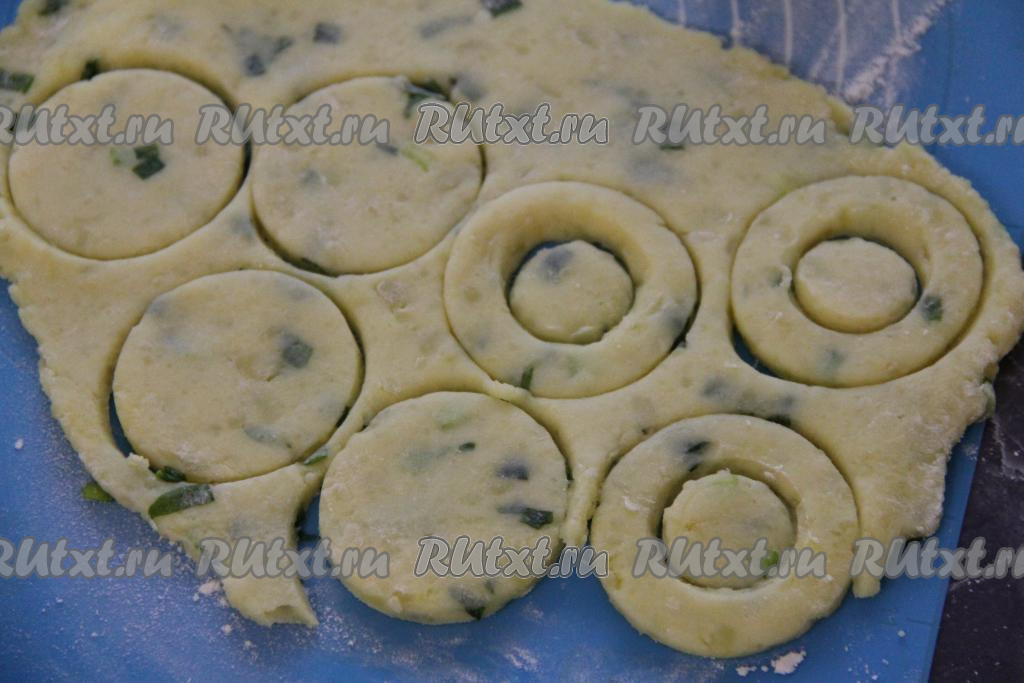 Раскатать картофельное тесто на припылённой мукой поверхности в пласт толщиной примерно 1 см. Вырезать колечки.