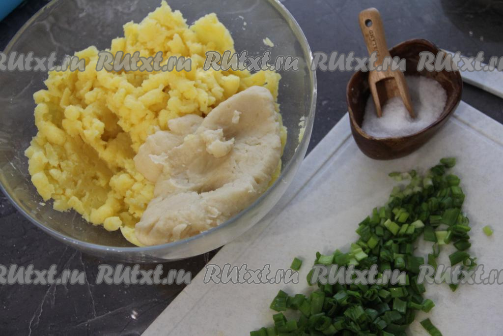Картошку размять в пюре. Затем в картофельное пюре добавить заварную массу, соль и мелко нарезанную зелень.