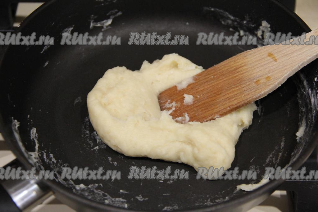 Влить воду комнатной температуры и перемешать, тщательно вмешивая её в мучную смесь. У нас получится нежная и пластичная заварная масса, напоминающая тесто.