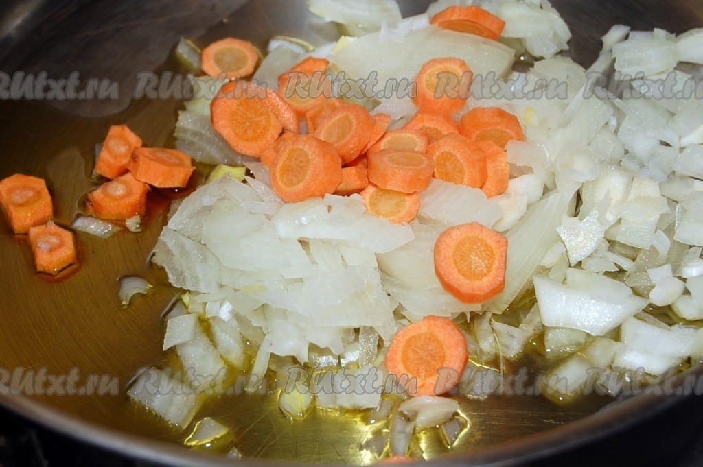 Для гарнира обжарить на другой сковороде мелко нарезанные картофель, морковь и репчатый лук, добавив специи по вкусу.