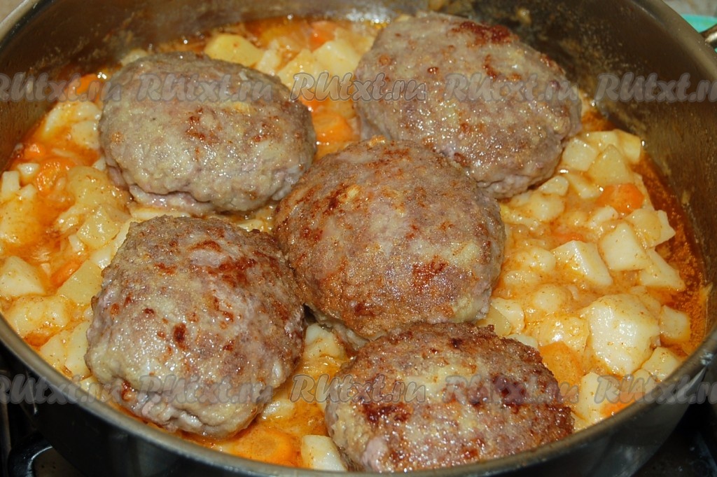 Обжаренные до румяной корочки мясные биточки, переложить в сковороду с гарниром, закрыть крышкой и довести до полной готовности.