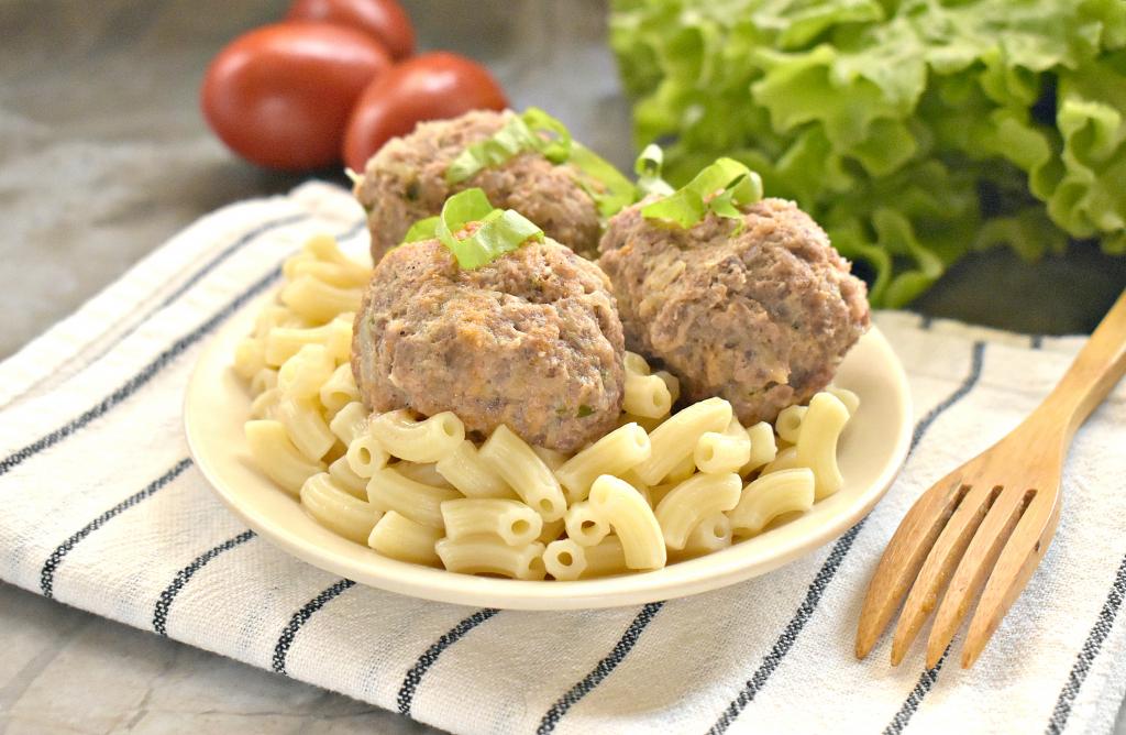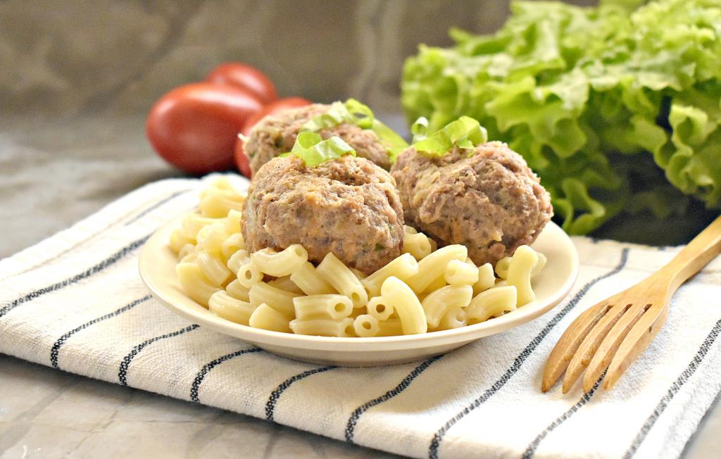 По истечении времени снимаем сковородку с огня. Вкусные, сочные, нежные тефтели, приготовленные из мясного фарша и кабачков, подаём к столу с гарниром. Я подала с макаронами и полила их соусом, в котором тушились тефтельки.