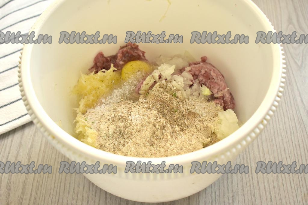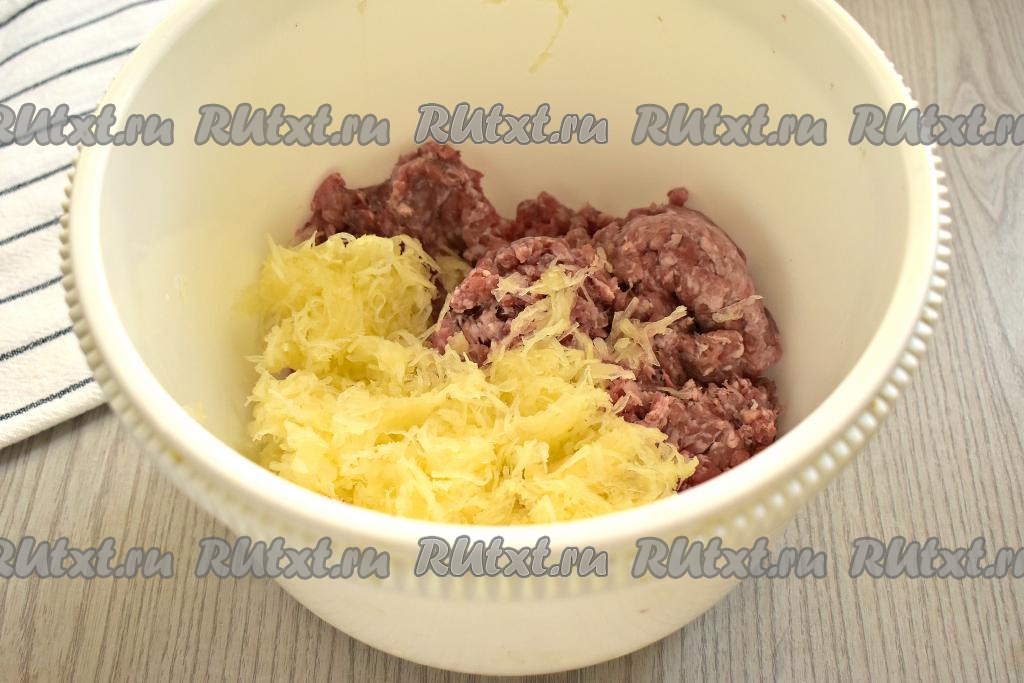 Кабачок очищаем от кожуры и семян (если семечки мелкие, их можно оставить). 250 грамм очищенного кабачка натираем на средней тёрке, отжимаем от сока (сок от кабачка нам не понадобится). Получившуюся кабачковую массу и фарш перекладываем в миску.