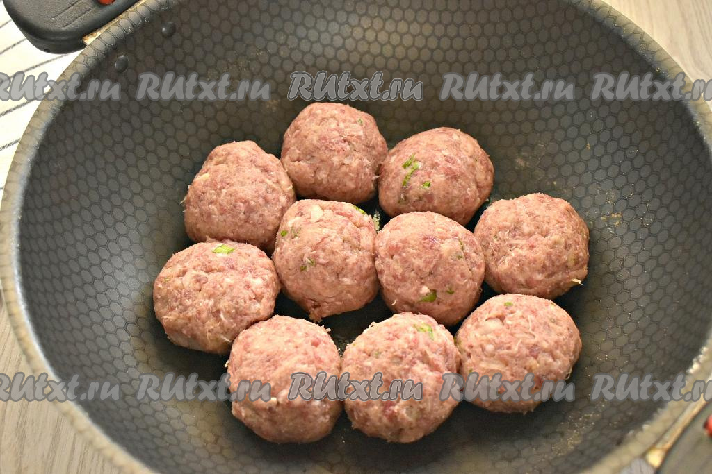Формируем круглые тефтели (у меня получилось 10 штук), выкладываем их в смазанную растительным маслом глубокую сковороду.