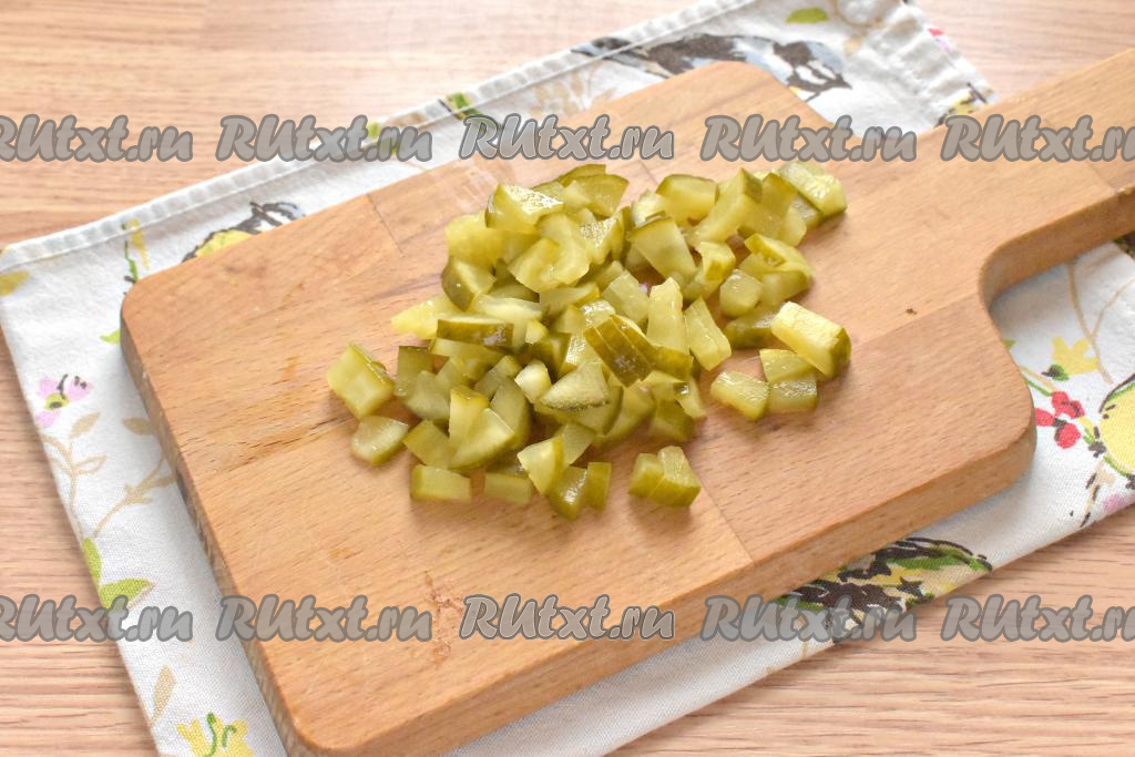 Солёные огурчики нарезаем на небольшие кусочки.