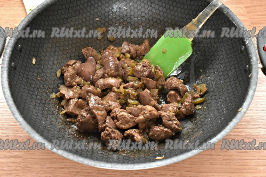 Затем выкладываем на сковороду подготовленную куриную печень.