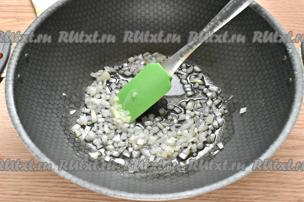 На сковороде разогреваем растительное масло, выкладываем лук и обжариваем его, помешивая, на умеренном огне до мягкости (мне на обжаривание потребовалось 4 минуты).