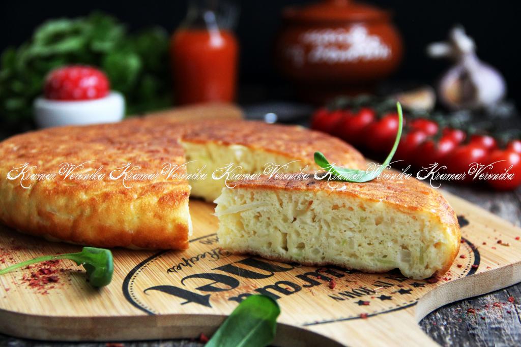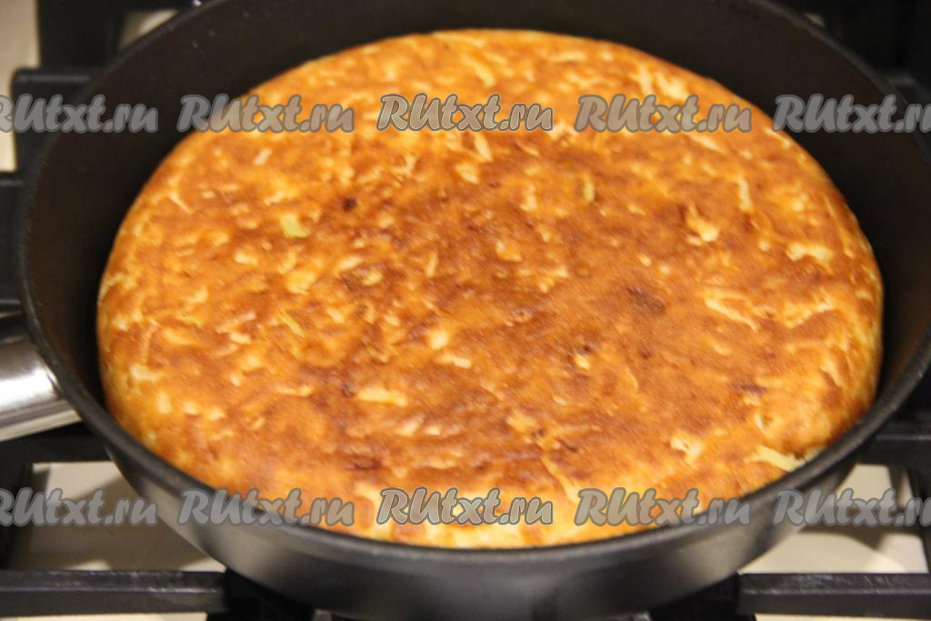 Затем аккуратно перевернуть пирог на вторую сторону (для того чтобы легче было перевернуть пирог, можно перевернуть его вначале со сковороды на тарелку, а затем вернуть на сковороду) и выпекать с другой стороны ещё минут 10. Пирог должен покрыться красивой золотистой корочкой.