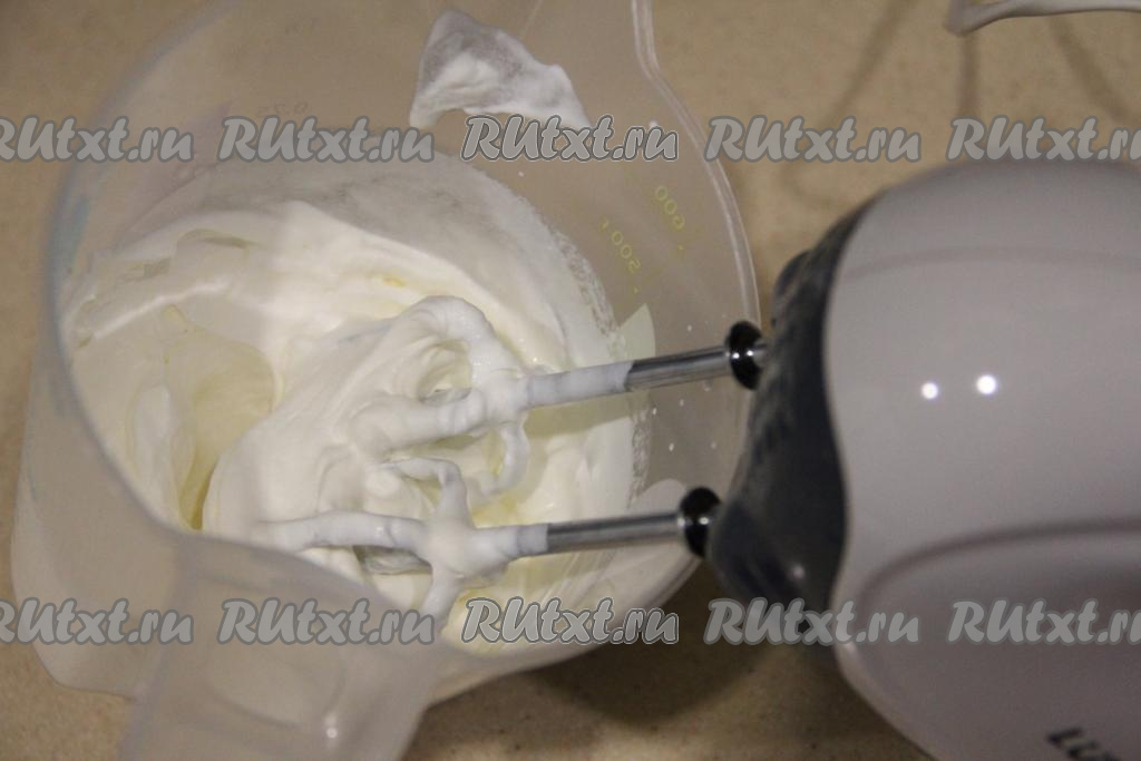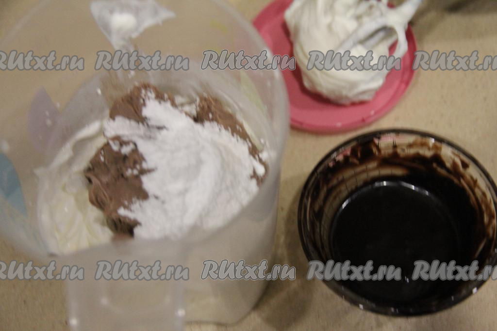 Во взбитые сливки добавить творожный сыр, 3 столовых ложки сахара, часть шоколадно-сливочной смеси, взбить миксером до однородности. Затем влить оставшуюся шоколадно-сливочную смесь, взбить миксером до однородности.