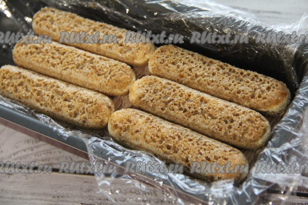 Выстелить форму пищевой плёнкой так, чтобы края плёнки свисали с боков формы (свисающими краями плёнки мы будем в дальнейшем накрывать сверху шоколадный тирамису). Окунать по одному печенью "Савоярди" в остывший кофе и выкладывать в форму в один слой. Я выложила 6 штук.