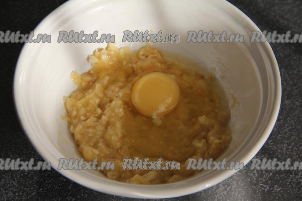 Банан очистить и размять вилкой в пюре. Добавить яйцо. В этом рецепте выпечки можно обойтись без сахара. Но если банан не очень спелый или вы любите сладкую выпечку, тогда на этом этапе добавьте 1 чайную ложку сахара.