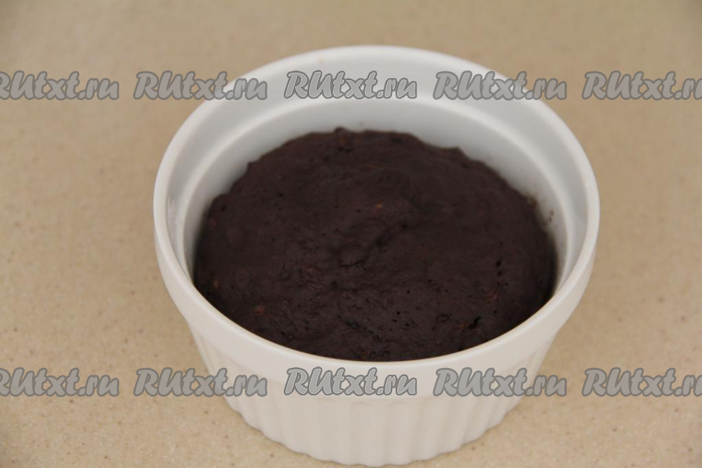 Выложить тесто в форму (или кружку), пригодную для приготовления в микроволной печи. Чтобы выпечку было проще достать из формы, можно перед выкладыванием теста смазать форму внутри растительным маслом, но я этого не делала.