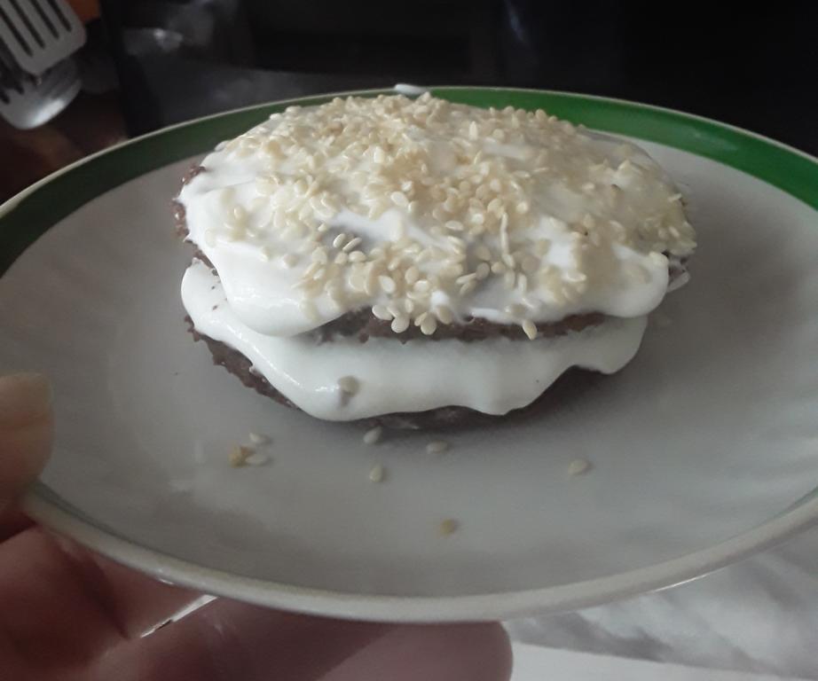 Не нашлось подходящей формы, поэтому разделила массу на две части и выпекала в маленьких чайных чашках. Потом каждый кекс разрезала вдоль и промазала мягким творожком с сахарозаменителем. Отличный ПП десерт.