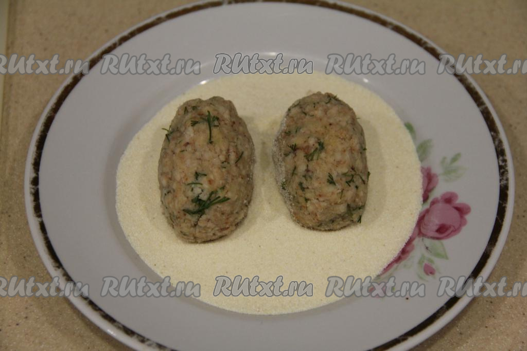 Манку высыпать в миску. Из фарша сформировать крокеты (котлетки) и обвалять их в манке со всех сторон. Всего у меня получилось 13 рыбных крокетов.