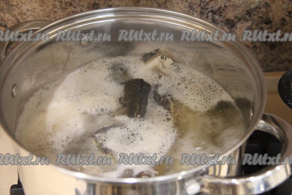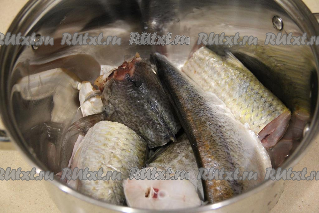 Рыбку очистить от чешуи и внутренностей, головы и плавники нужно отрезать. Нарезать рыбу на крупные кусочки, выложить в кастрюлю. Залить рыбку полностью водой и поставить на огонь.