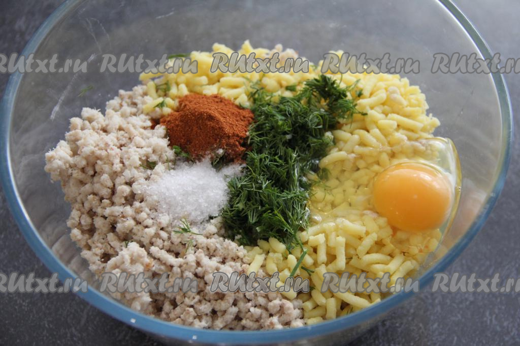 Соединить в миске рыбный фарш, картошку, паприку, соль и сырое яйцо. Зелень промыть водой, мелко нарезать и добавить к фаршу.