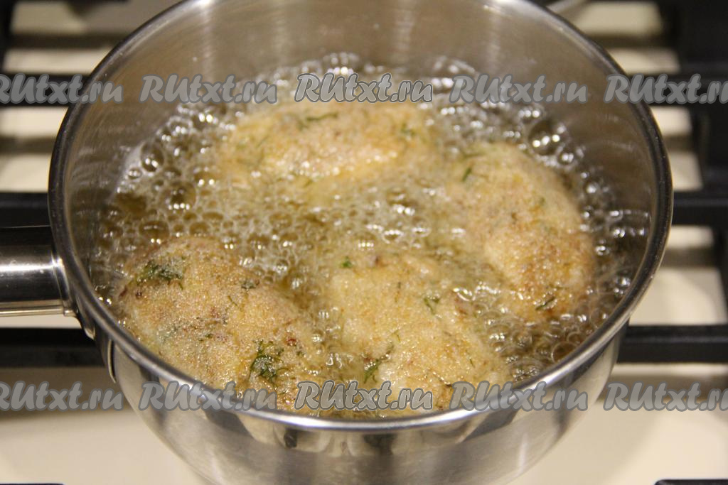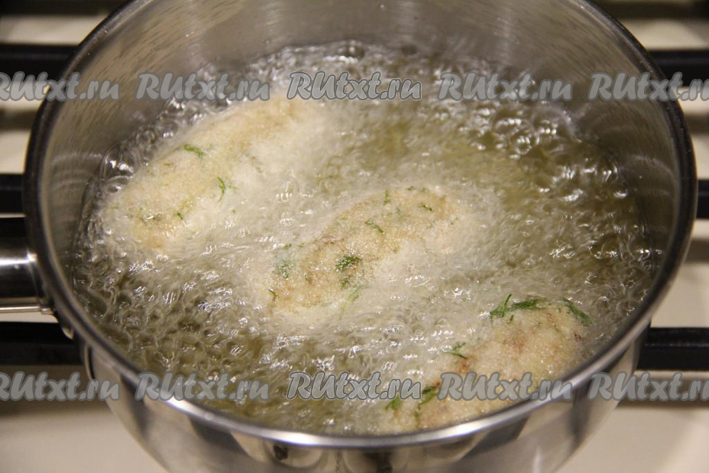 Растительное масло хорошо разогреть, масла не жалейте, крокеты должны обжариваться в большом количестве масла (во фритюре). Аккуратно выложить крокеты во фритюр (масло горячее, так что будьте особенно внимательны).