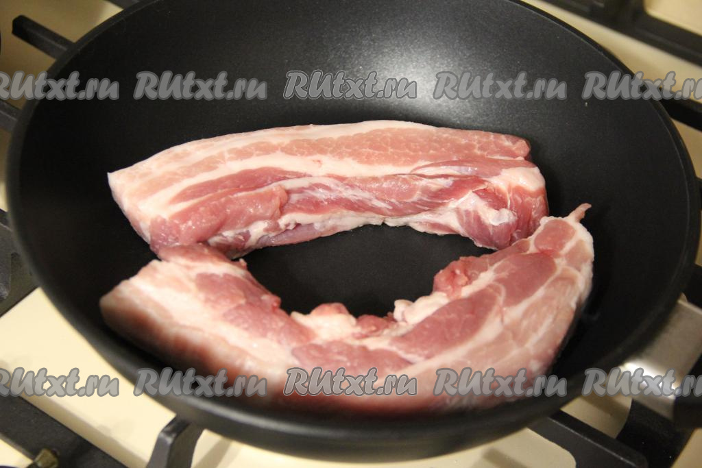 Сковороду разогреть, выложить в неё кусочки грудинки.