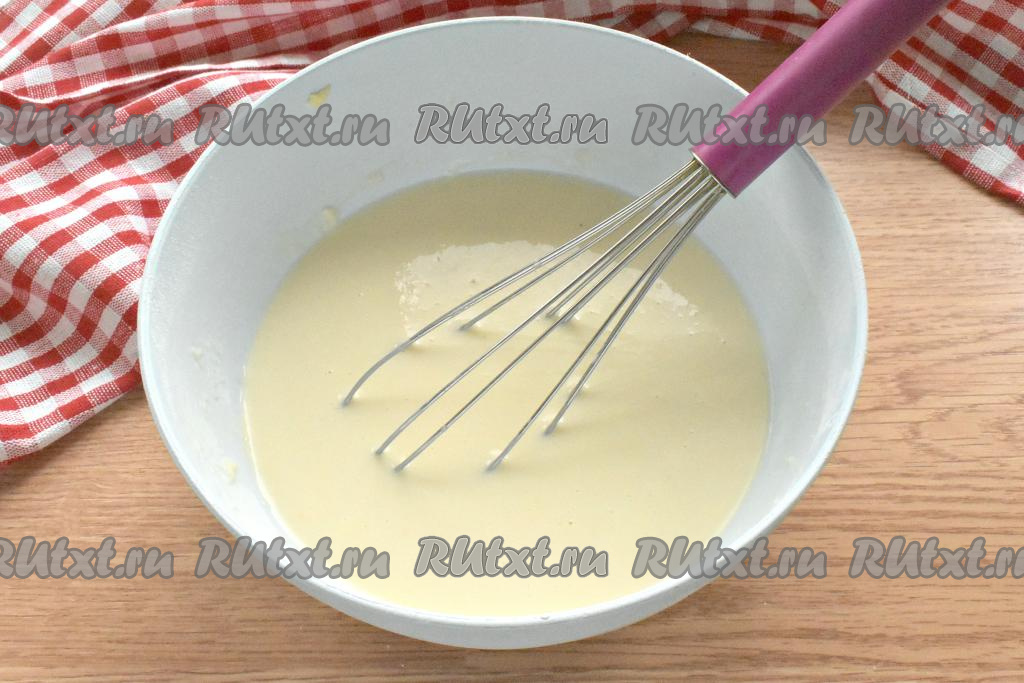 В это тесто небольшими порциями, интенсивно перемешивая венчиком, начинаем вливать горячее молоко.