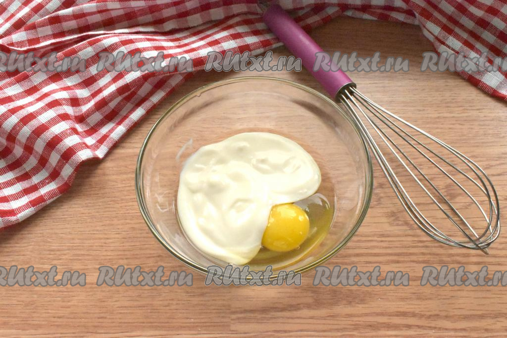 В отдельную миску перекладываем сметану, добавляем яйцо, перемешиваем венчиком до получения однородной смеси.