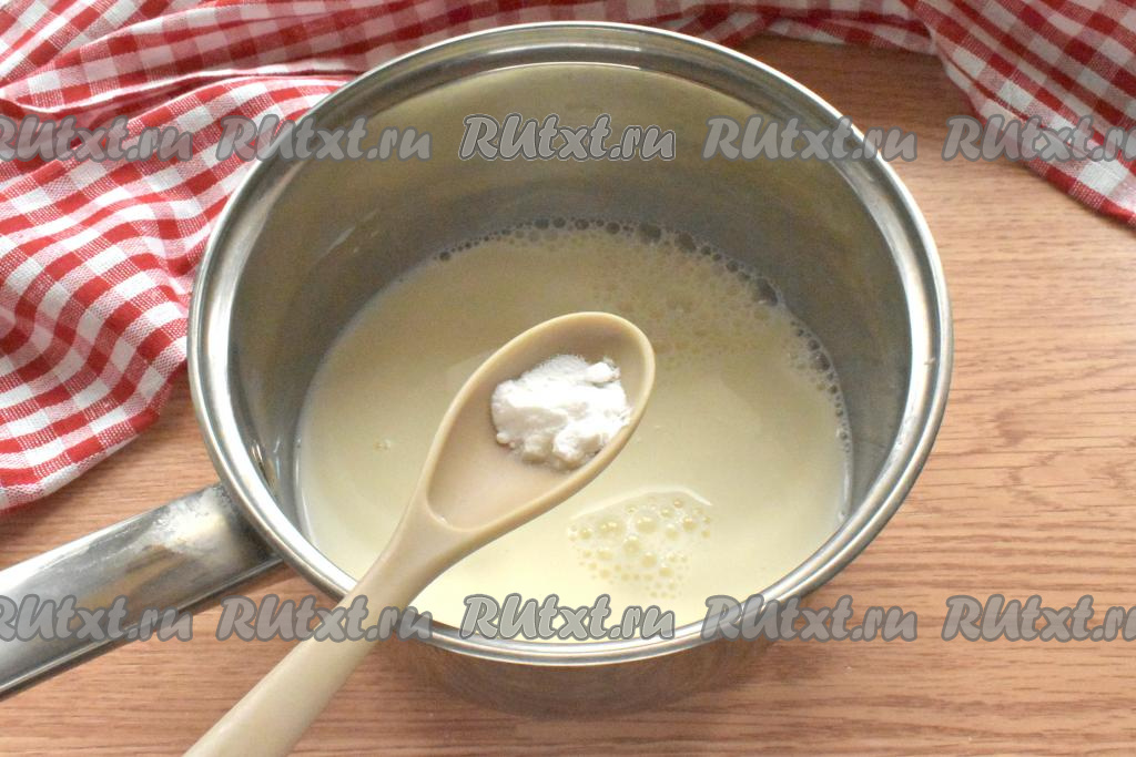 Молоко переливаем в ковшик (или маленькую кастрюльку), нагреваем на огне примерно до 50-60 градусов. В горячее молоко всыпаем соду и перемешиваем.