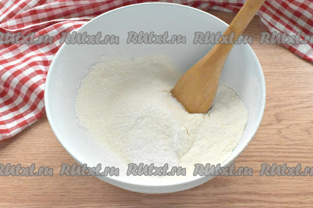 В глубокую миску просеиваем муку, всыпаем сахар и соль, сразу перемешиваем.