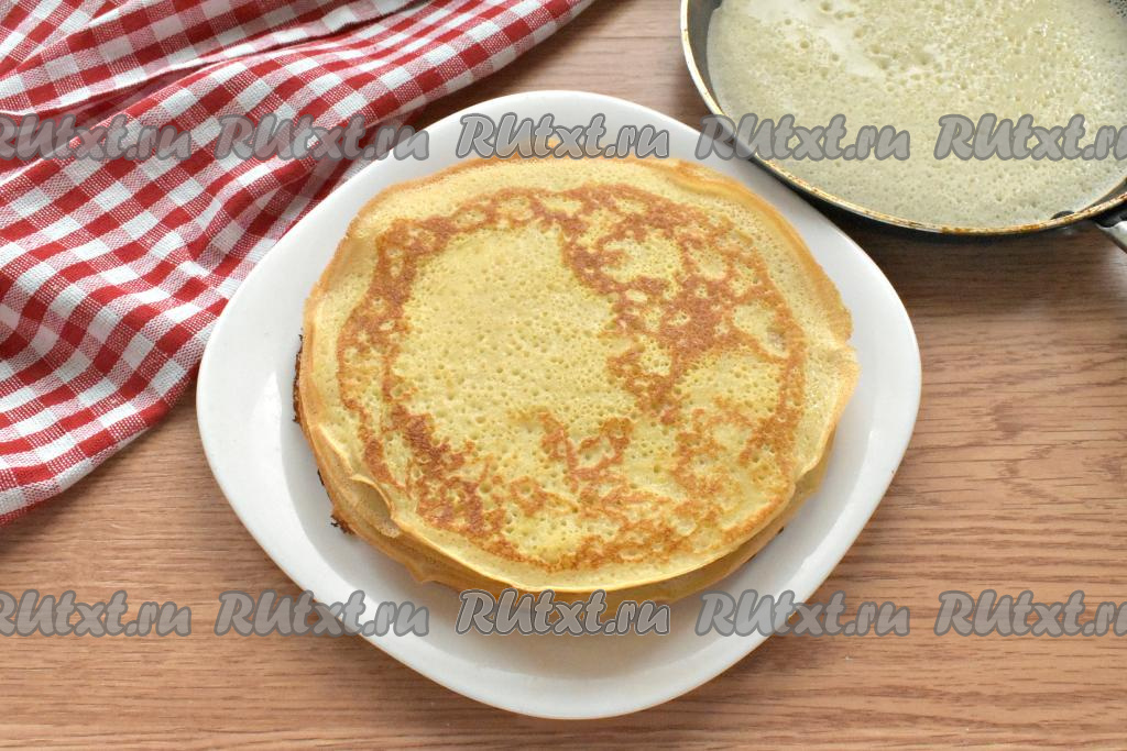 Спустя это время приступаем к жарке блинов. Смазываем сковороду маслом и очень хорошо разогреваем. Выливаем на сковороду половник блинного теста, распределяя по всему дну сковороды. Жарим блинчик с каждой стороны по минуте (до подрумянивания) на среднем огне, затем перекладываем на тарелку. Сковороду больше смазывать не нужно, ведь масло уже есть в тесте. Постепенно жарим все блинчики. Тесто периодически перемешиваем, ведь оно оседает на дно миски. Я готовила блины на сковороде диметром 18 сантиметров, у меня получилось 13 штук.