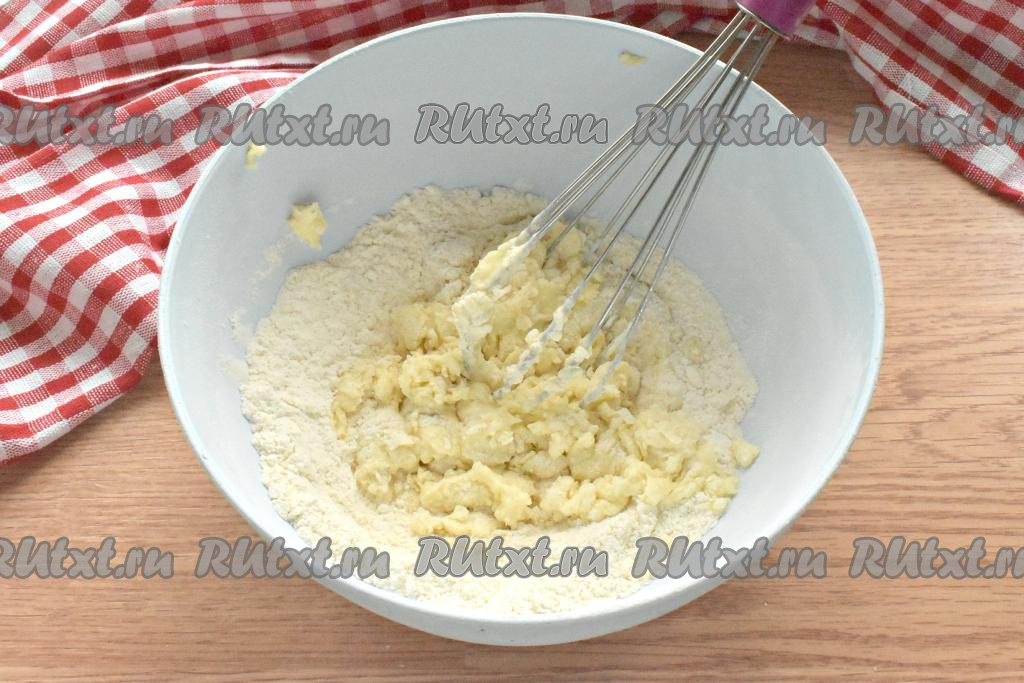 Смесь из яйца и сметаны переливаем в смесь муки, сахара и соли, перемешиваем венчиком.