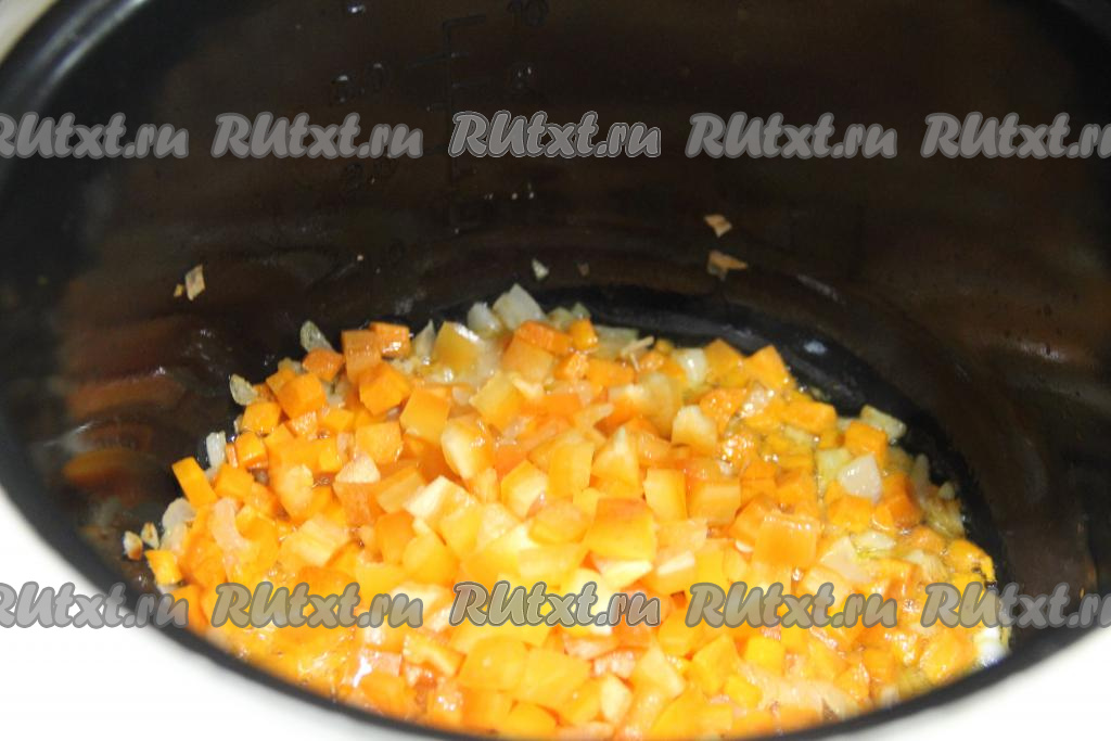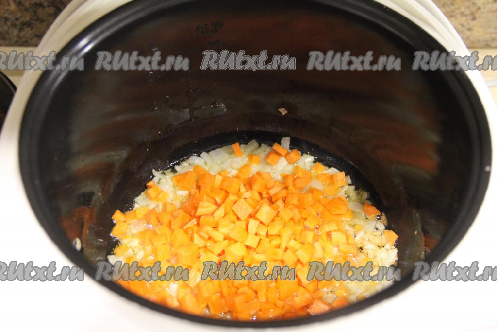 Морковку почистить, нарезать на мелкие кубики и переложить в чашу мультиварки к обжаренному луку. Обжаривать овощи минут 5, помешивая.