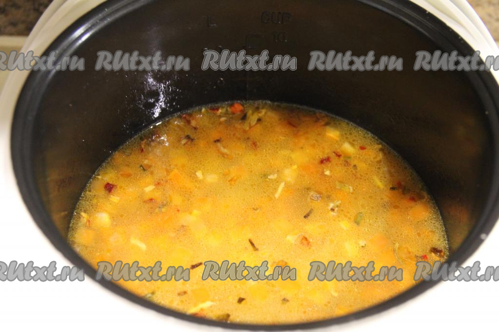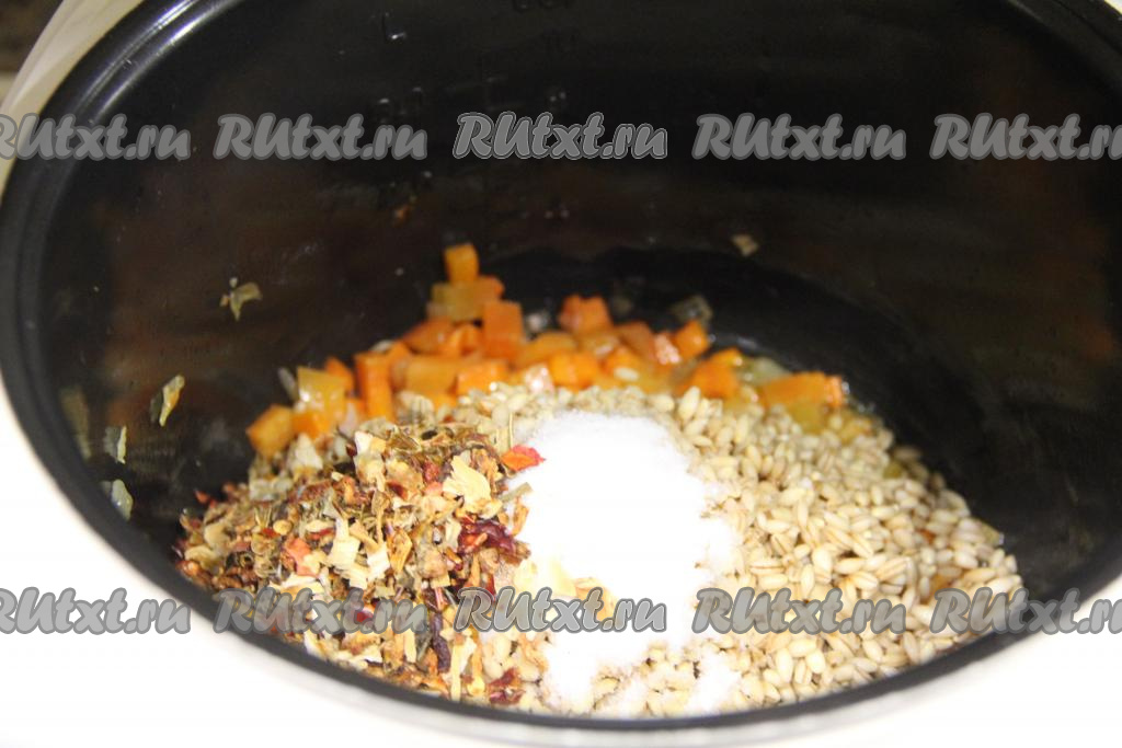 Перловку откинуть на сито, дать стечь воде, а затем переложить в чашу мультиварки с овощами, всыпать соль и специи (в качестве специй я использовала сушёные овощи).