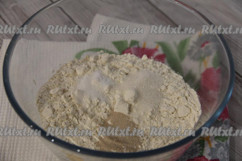 В объёмной миске соединить просеянную муку, сахар, дрожжи и соль.