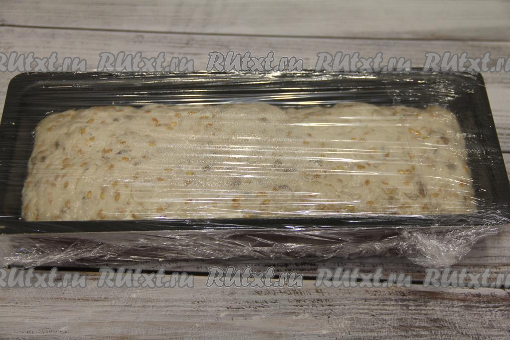 В форму для выпечки выложить тесто и разровнять. Накрыть форму пищевой плёнкой и поставить тесто для ночного хлеба в холодильник для расстойки на 10-12 часов (я ставлю в холодильник на ночь).
