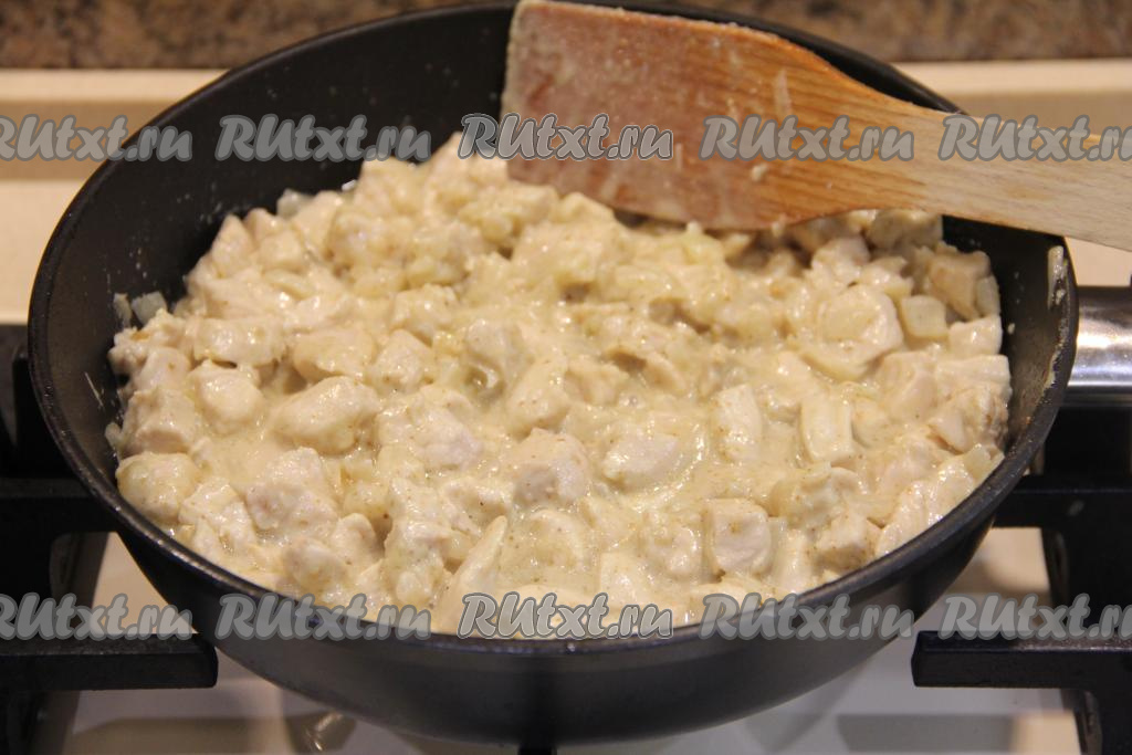 Томить на небольшом огне 7 минут, иногда помешивая. Затем снять куриную начинку с огня, дать остыть.