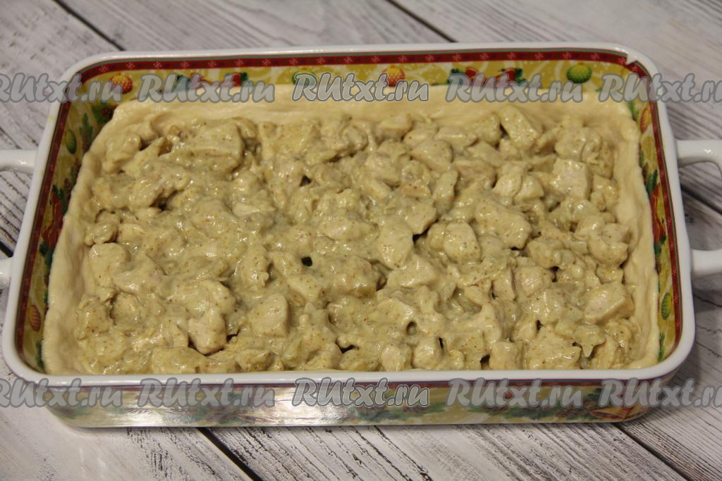 На тесто равномерно выложить куриную начинку и разровнять.