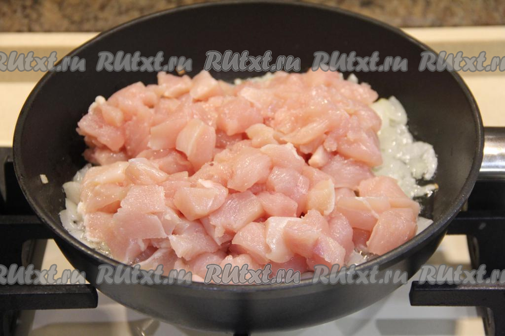 Куриное филе промыть, немного обсушить, нарезать на мелкие кубики и добавить в сковороду к луку, перемешать.