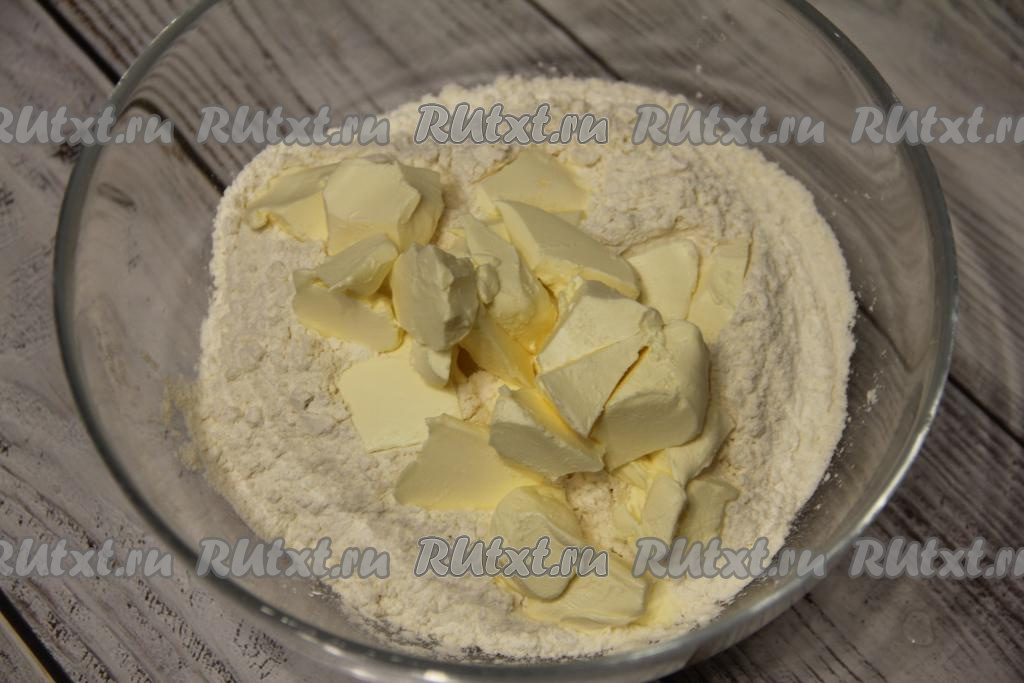 Сперва замесим тесто, для этого нужно соединить в миске муку, соль и соду, добавить кусочки холодного сливочного масла.