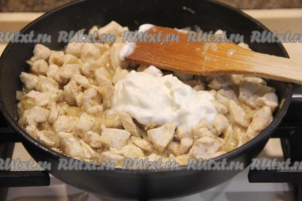 Обжаривать куриное мясо с луком минут 10, иногда помешивая. Добавить соль, карри (можно добавить и другие специи).