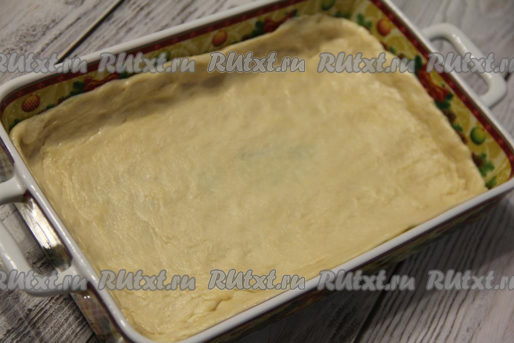 "Отдохнувшее" тесто разделить на две части. Одну часть сделать чуть больше - это будет основа пирога. В форму для выпечки (у меня форма размером 26 сантиметров на 17 сантиметров) выложить большую часть теста и сформировать бортик.