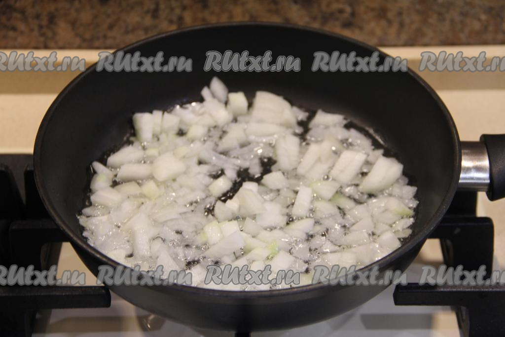 Пока тесто "отдыхает", приготовим начинку. Для этого в сковороду нужно влить растительное масло, добавить очищенный и мелко нарезанный лук, обжаривать его минут 5, помешивая, на среднем огне.