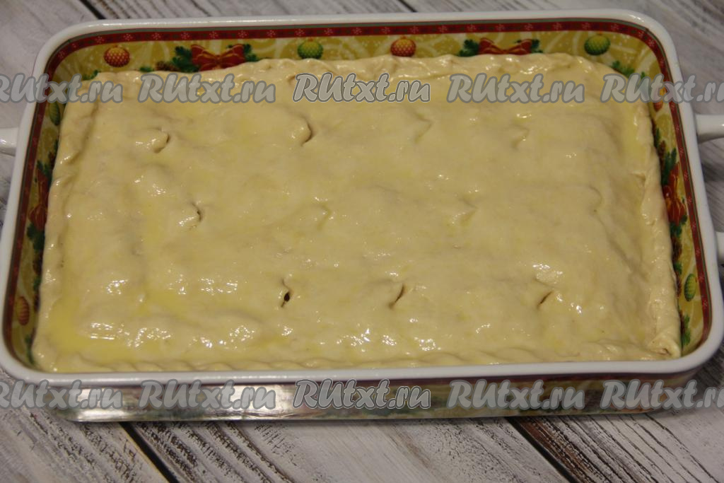 Вторую часть теста на присыпанной мукой поверхности раскатать в прямоугольный пласт, размер которого чуть больше размера формы для выпечки, переложить этот пласт теста в форму, накрывая начинку. Края теста хорошо защипнуть со всех сторон, формируя закрытый пирог. С помощью ножниц сделать несколько надрезов на поверхности теста. Смазать верх пирога взбитым желтком.