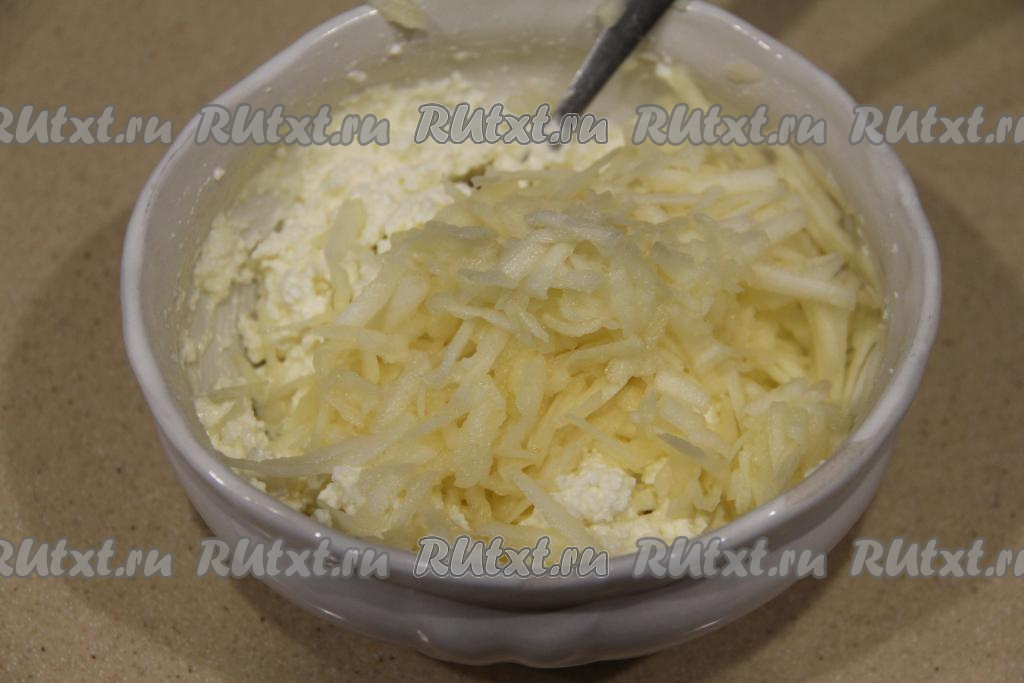 Яблоко, очищенное от кожуры и семечек, натереть на крупной тёрке и добавить в творожную массу, перемешать творожно-яблочную массу.