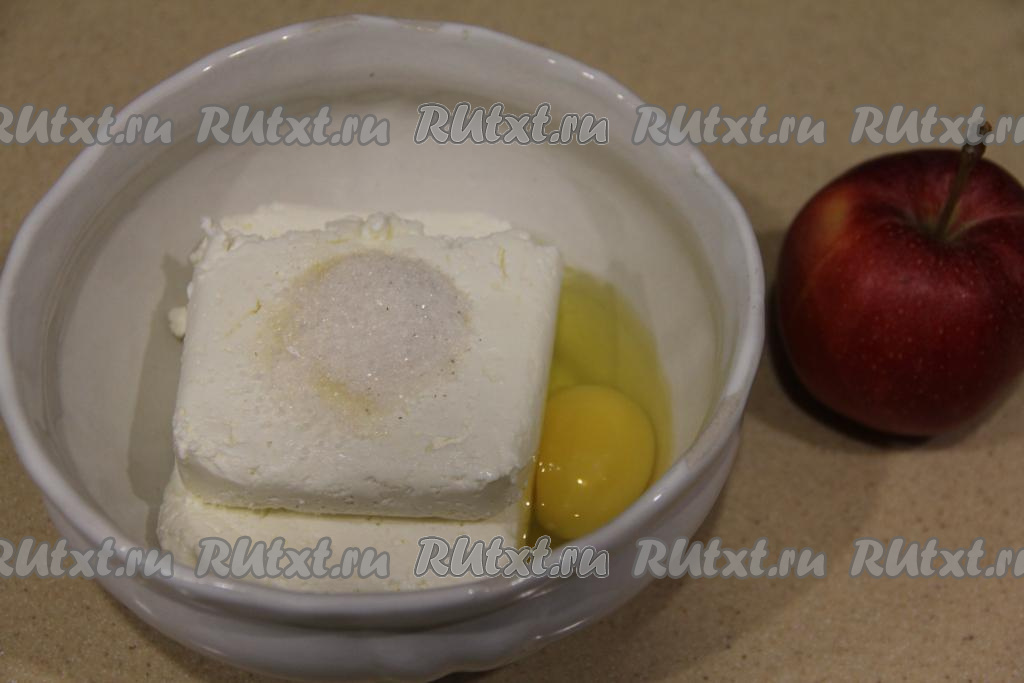 Соединить творог, 1 столовую ложку сахара (если любите сладкие запеканки или яблоко кисловато, тогда добавьте немного больше сахара) и яйцо в миске.