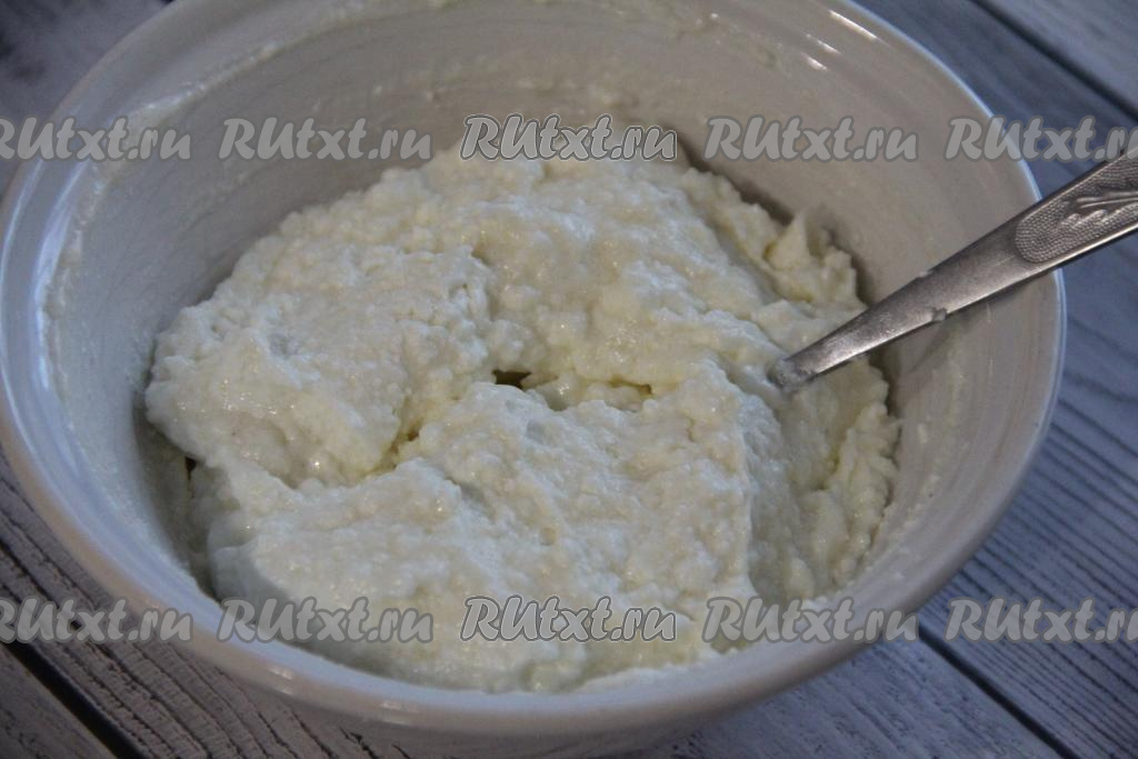 Вначале сделаем начинку для ватрушек, для этого в достаточно глубокой посуде нужно соединить творог, ванильный сахар, сметану и сахар.