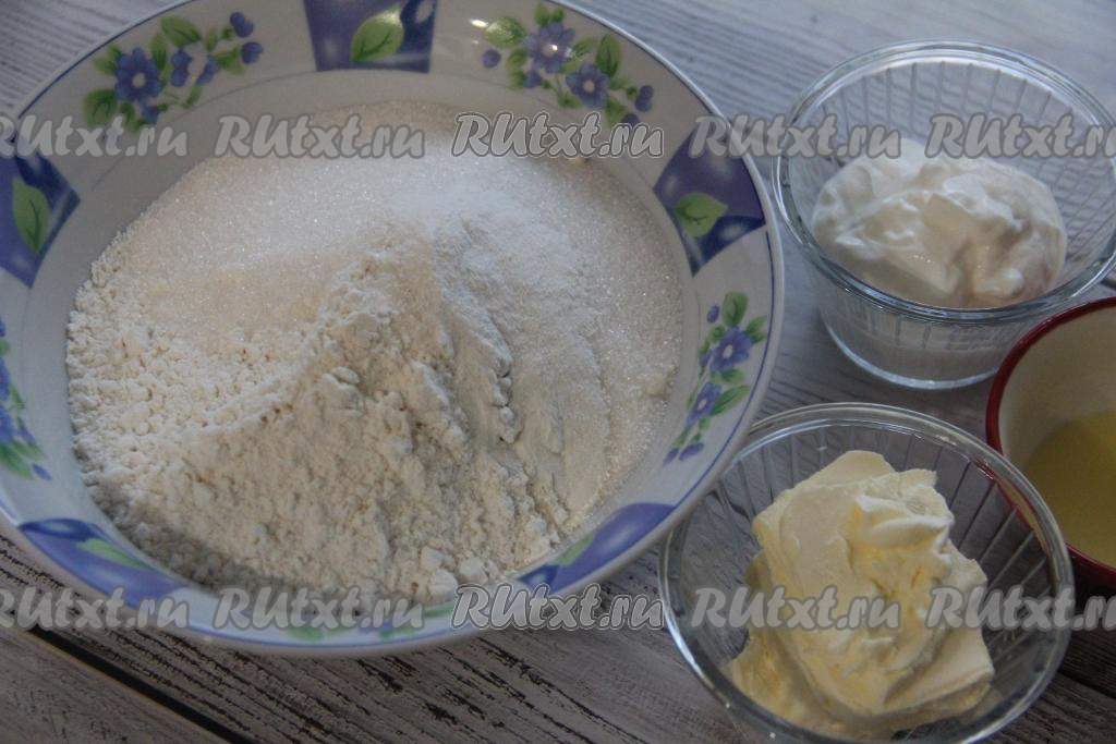 Теперь займёмся песочным тестом для ватрушек, прежде всего нужно муку просеять в отдельную миску, всыпать разрыхлитель и сахар.