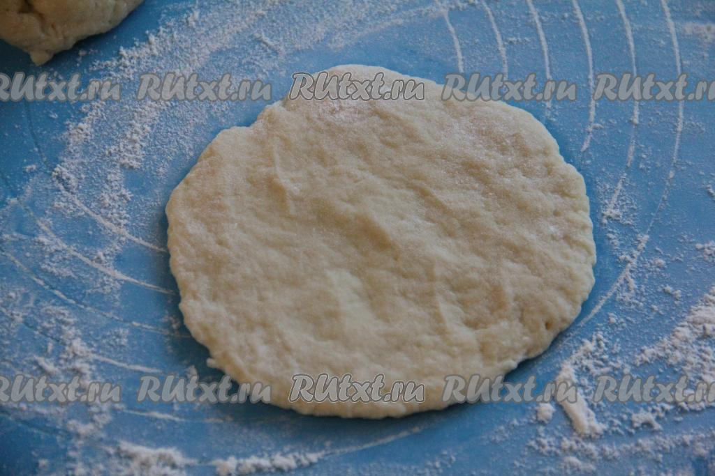 Разделить песочное тесто на 8 частей. Рабочую поверхность припылить мукой. Сформировать из каждой части теста не тонкую лепёшку.