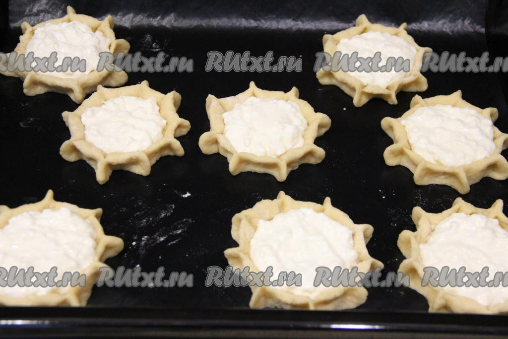 Выпекать песочные ватрушки с творогом в разогретой духовке при температуре 200 градусов минут 35 (до лёгкого подрумянивания).