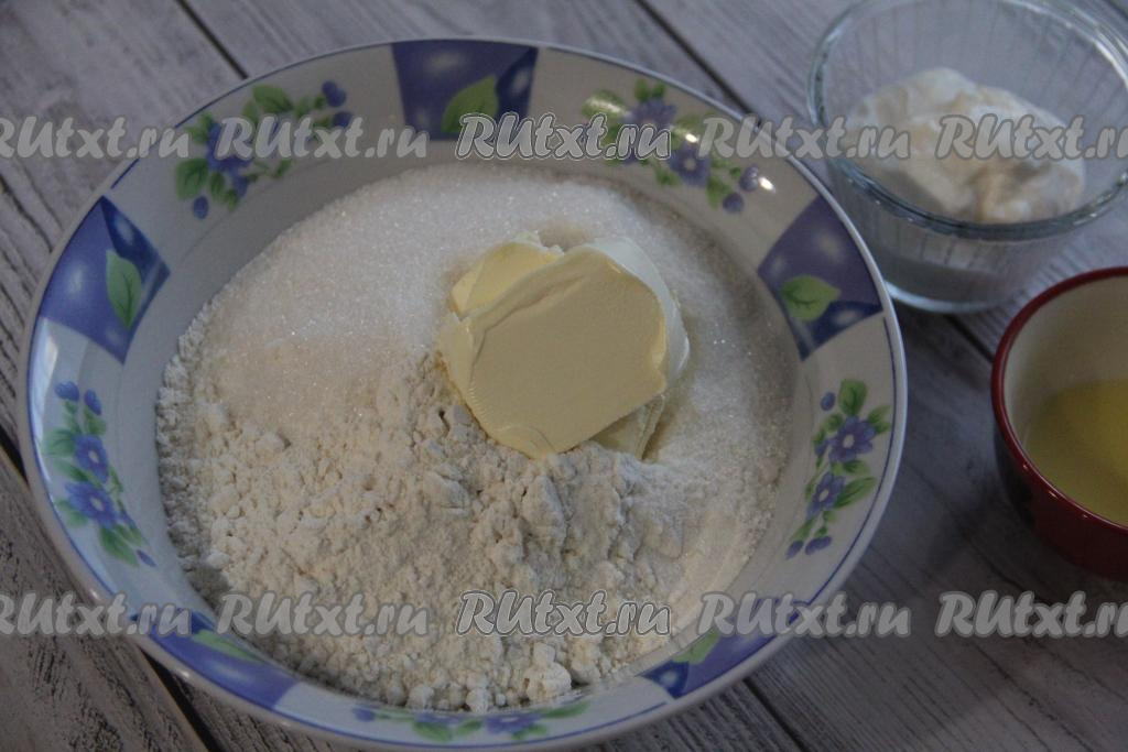 Добавить мягкое сливочное масло. Перетереть получившуюся массу руками до получения крошки.