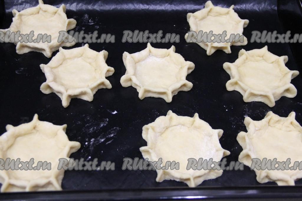 Защипать края каждой лепёшки, как на фото, и выложить песочную основу ватрушек на противень, застеленный ковриком для выпечки (или пергаментом). У нас получатся 8 заготовок песочных ватрушек.